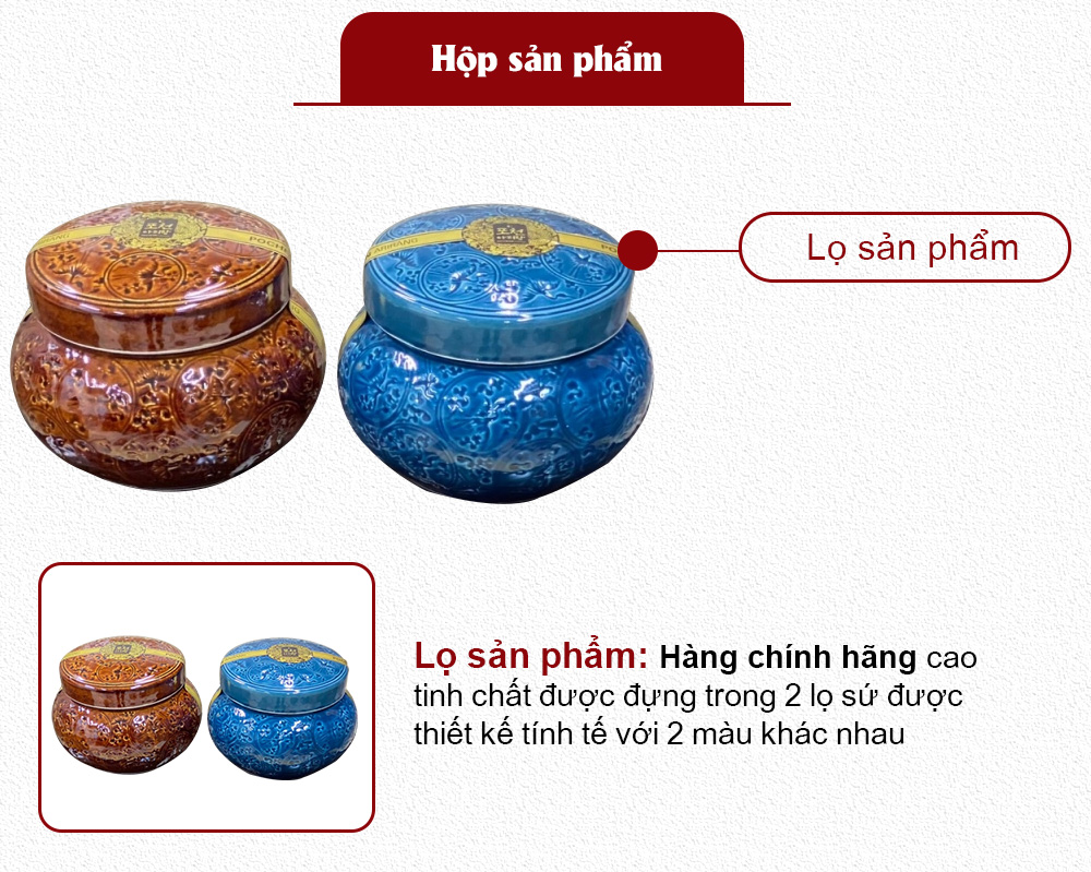 Sản phẩm được đóng gói trong 2 hũ sứ cao cấp, mỗi hũ chứa 500g cao sâm nguyên chất. Bên ngoài là hộp gỗ quý được chạm khắc tinh xảo, thể hiện đẳng cấp của một sản phẩm cao cấp. Đây là món quà biếu tặng vô cùng ý nghĩa và sang trọng.