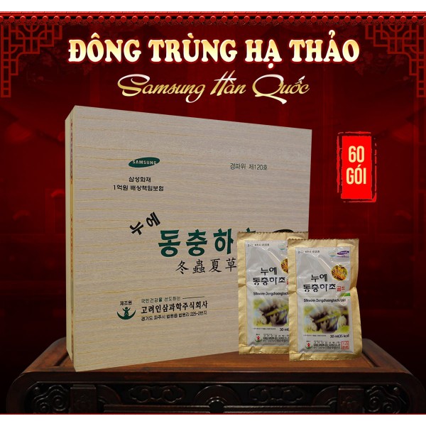 Quà tặng sức khỏe Nước đông trùng hạ thảo Samsung Hàn Quốc hộp gỗ 60 gói là món quà biếu sức khỏe cao cấp được người Hàn Quốc rất ưa chuộng và đánh giá cao về giá trị mang lại. Biếu tiền bác vật chất không bằng biếu hộp nước đồng trùng hạ thảo mong muốn sức khỏe, sống lâu trăm tuổi đến người được nhận. Đây là sản phẩm được sản xuất hoàn toàn từ nấm đông trùng Hàn Quốc, đảm bảo quy trình, do chính phủ bảo trợ nên an toàn, hiệu quả cao.