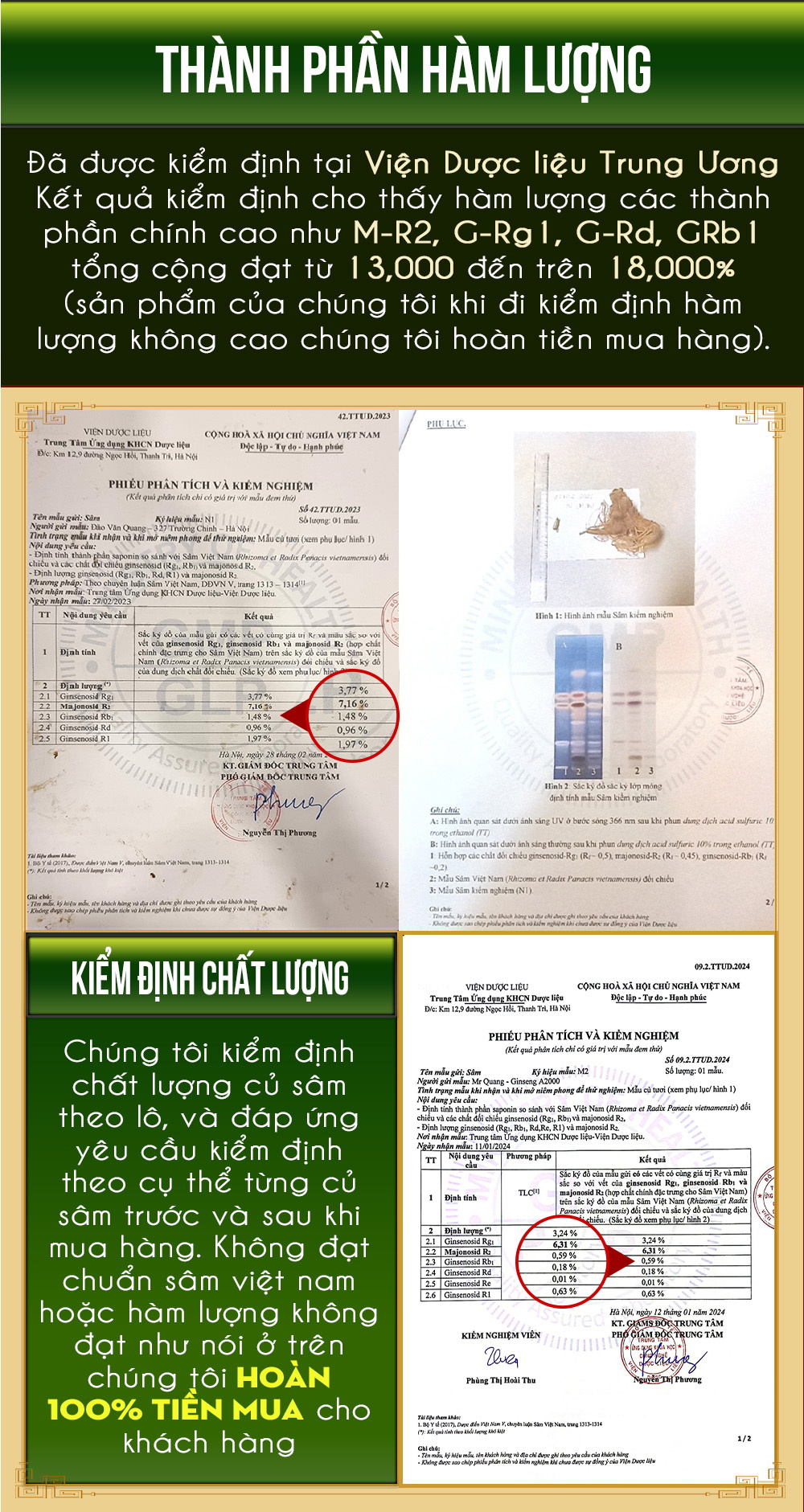 Chúng tôi và khách hàng đã làm kiểm tra 1 là định tính, 2 là định lượng. Phân tích định lượng hơn 52 saponin trong củ sâm nhưng đặc biệt nhất là cho ra 6 thành phần quan trọng nhất trong củ sâm để đánh giá mỗi thành phần đạt bao nhiêu % dưỡng chất ginsenosid (Rg1, Rb1, Rd, Re, R1) và majonosid R2 trong 6 thành phần chính có 2 thành phần quan trọng nhất là Mr2 và Rg1 nếu 2 thành phần này không có hoặc có nhưng thấp ở trong củ sâm thì cho dù bạn mua củ sâm giá hàng tỷ / 1 kg cũng đều không có giá trị, ngược nại nếu sâm bạn mua được giá tốt vài triệu nhưng bạn chọn được nhà vườn uy tin kết quả kiểm định dưỡng chất cao bạn là người tiêu dung thông thái , mẫu được bạn lên phân tích tại Viện Dược liệu bằng phương pháp dùng ánh sáng UV ở bước sóng 366 mm và phun dung dịch acid sulfuric 10% trong ethanol (TT).