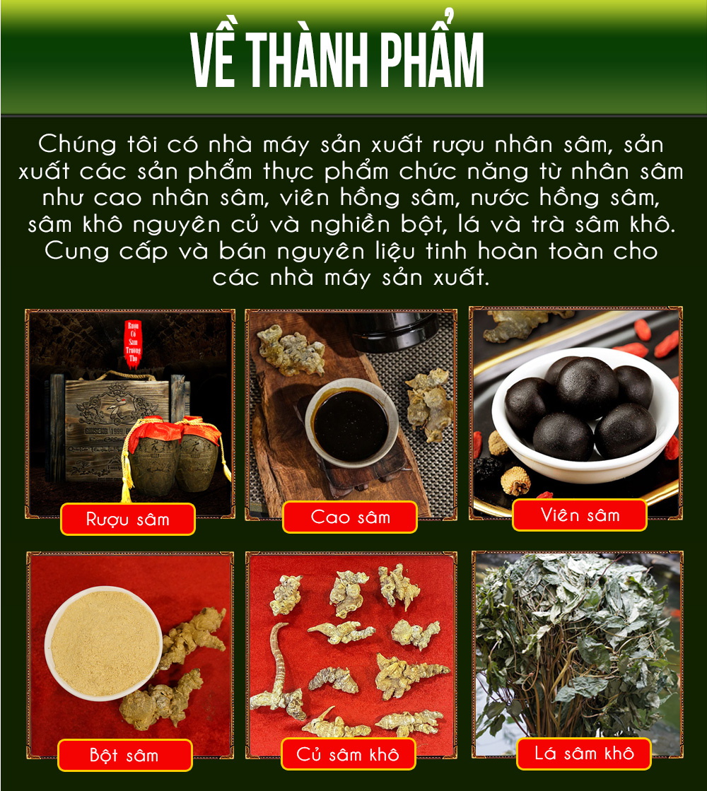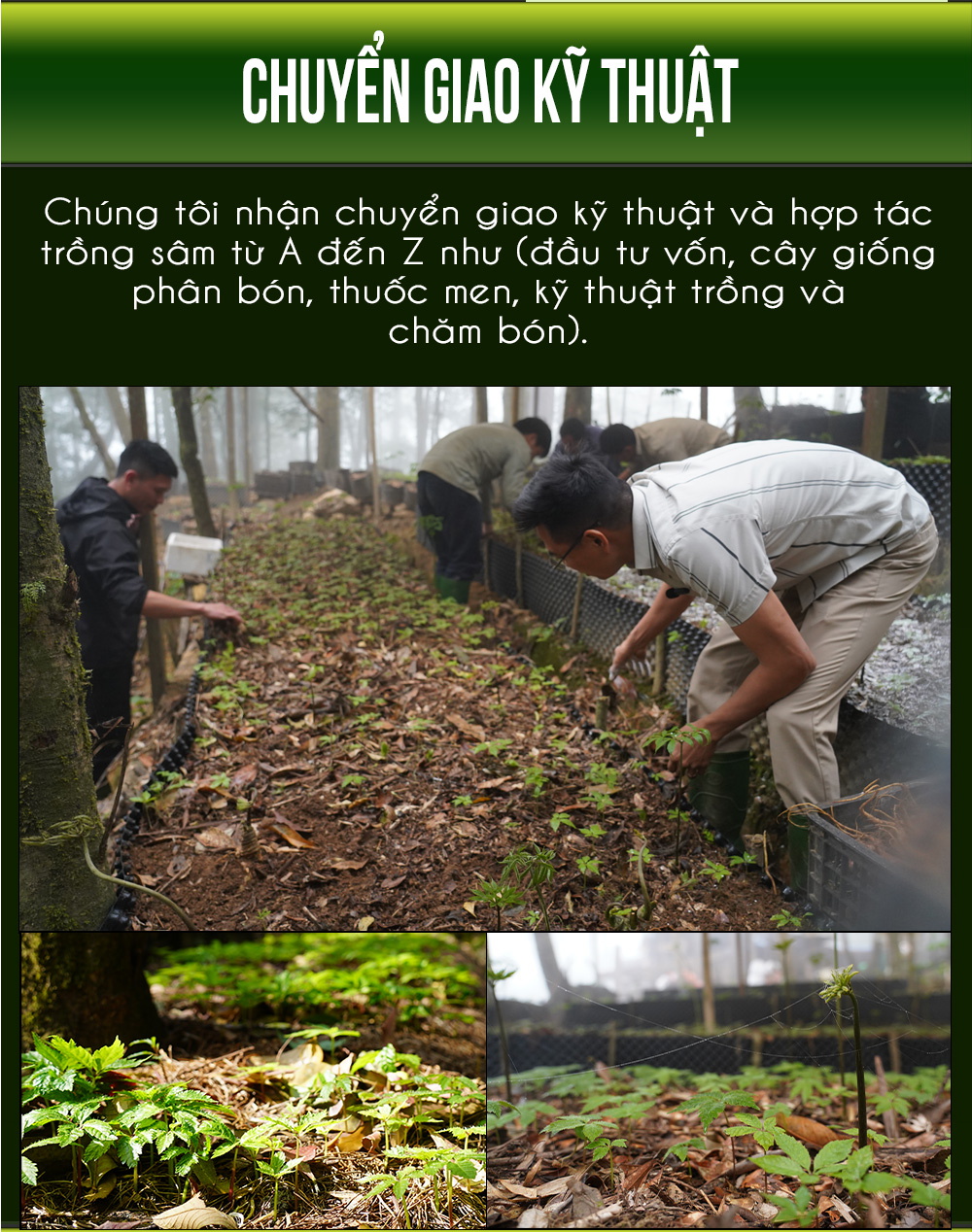 - Sâm do nhà GINSENG tự trồng, tỷ lệ sống và thành công đạt 99%, vấn đầu tư của chúng tôi “tự” tự bỏ công làm nãi, tự gom hạt và cây giống trong rừng nguyên sinh, tự trồng không phải thuê nhiều nhân công, tự bảo vệ, tự bán trực tiếp đến tay người tiêu dung, chúng tôi nói “không” không kêu gọi vốn, không thuốc và chất bảo quản, không bán sâm kém chất lượng, không bán sâm thành phẩm rưới 6 năm tuổi, không bán cây giống hạt giống sâu bệnh, thu hoạch trực tiếp 100% từ vườn sâm tự nhiên và chuỗi liên kết, chúng tôi trực tiếp thu gom bao tiêu sâm cho bà con, các hợp tác xã trồng sâm được chúng tôi liên doanh liên kết chuyển giao kỹ thuật,.