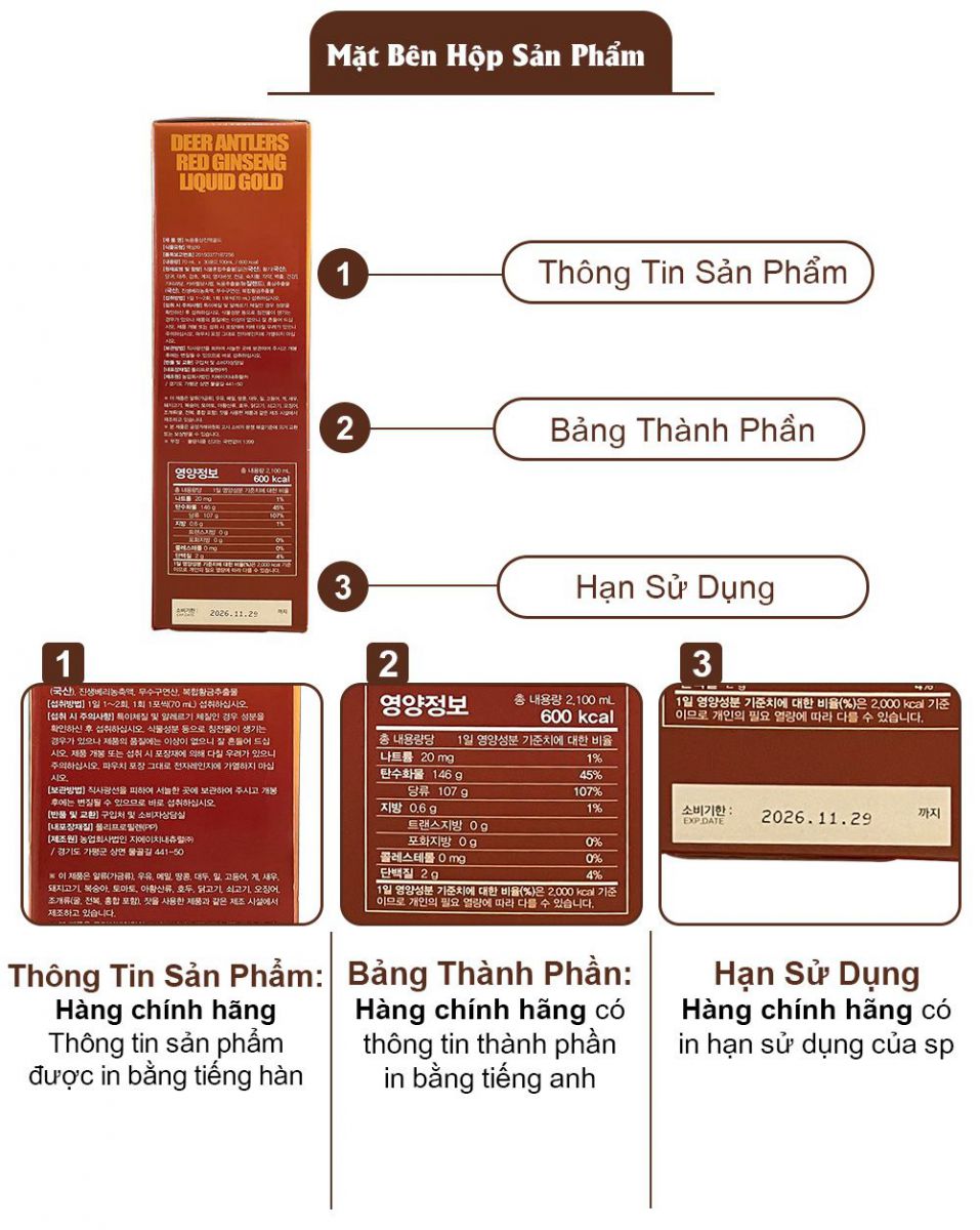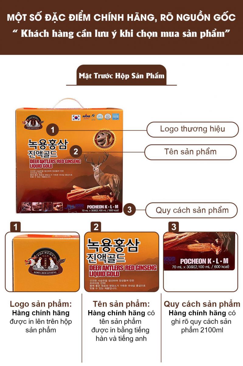 Một số đặc điểm nhận biết sản phẩm chính hãng Nước hồng sâm nhung hươu tự nhiên gold Pecheon KLM hộp 30 gói :